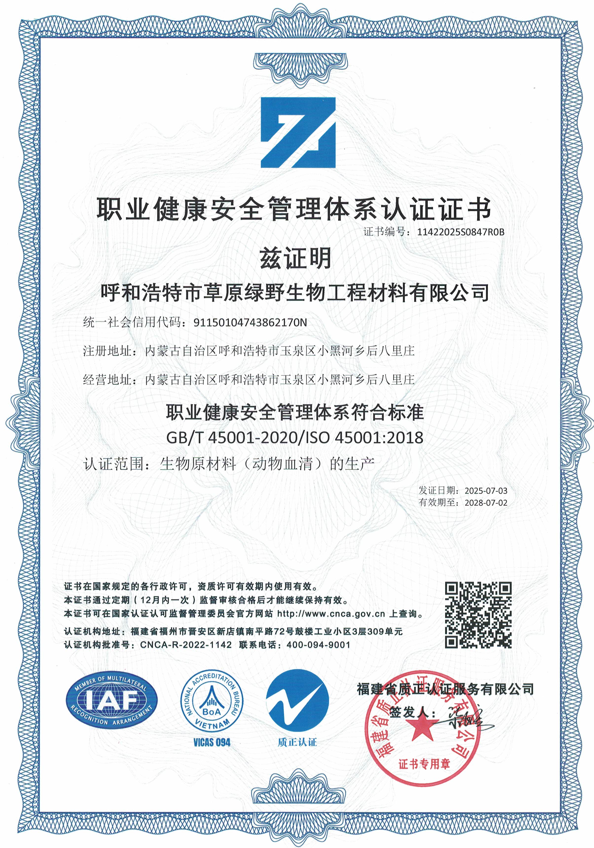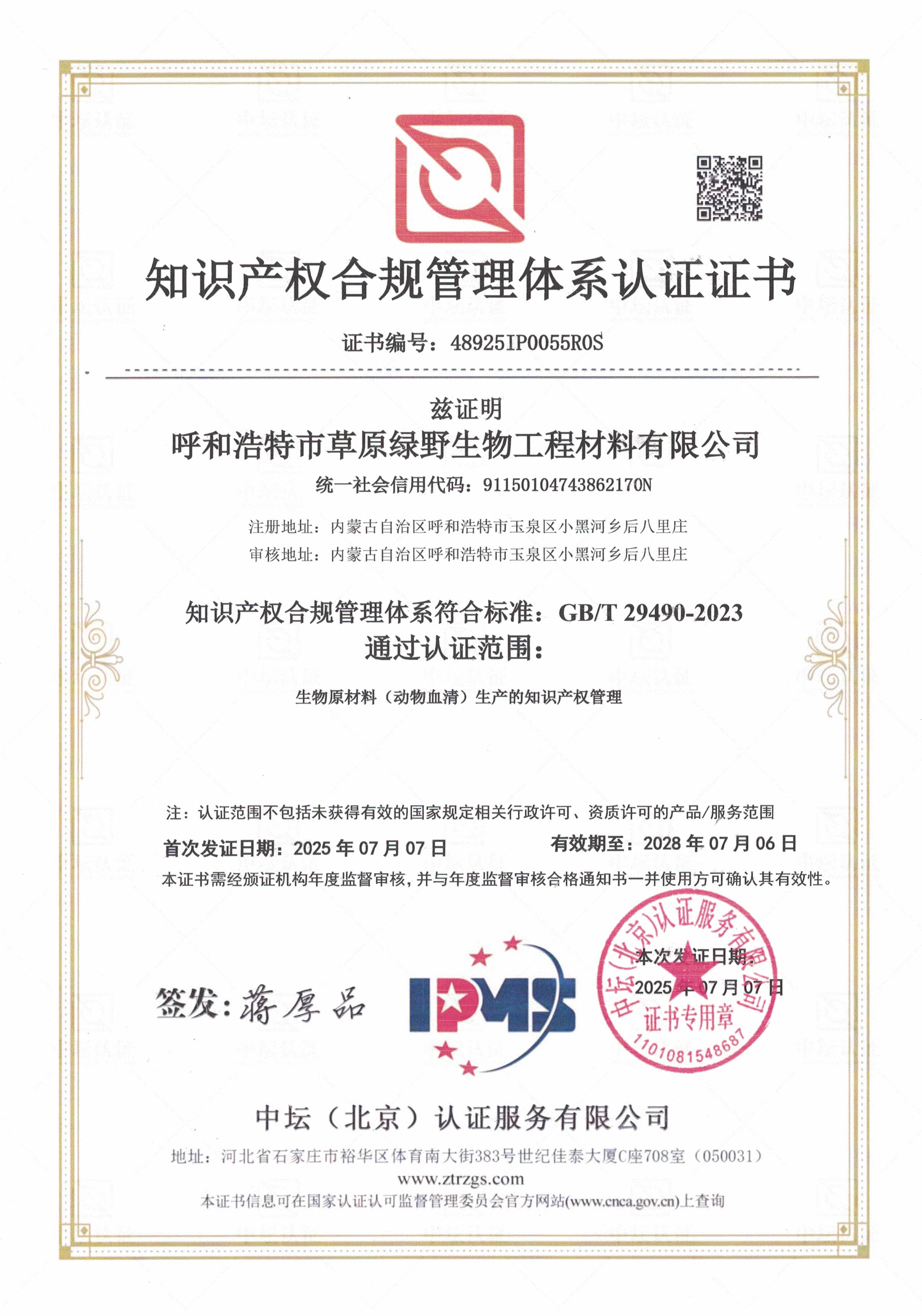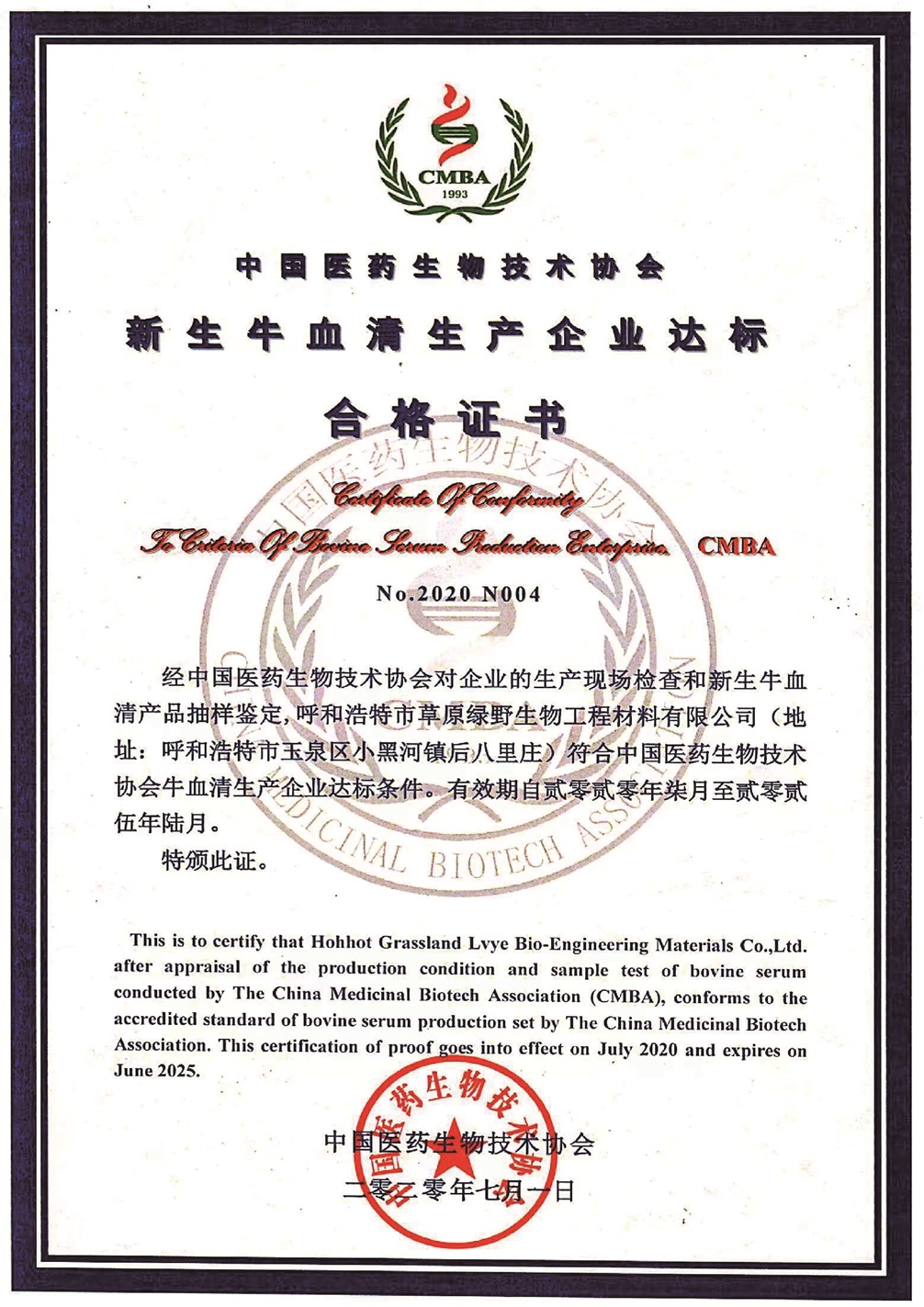 公司至今已多次通過(guò)中國(guó)醫(yī)藥生物技術(shù)協(xié)會(huì)《牛血清生產(chǎn)企業(yè)達(dá)標(biāo)》認(rèn)證、《牛血清生產(chǎn)質(zhì)量達(dá)標(biāo)企業(yè)》認(rèn)證。ISO9001質(zhì)量管理體系認(rèn)證、ISO45001職業(yè)健康安全管理體系認(rèn)證、ISO14001環(huán)境管理體系認(rèn)證、ISO13485醫(yī)療器械質(zhì)量管理體系認(rèn)證、ISO50001能源管理體系認(rèn)證、GB/T29490知識(shí)產(chǎn)權(quán)合規(guī)管理體系認(rèn)證、AAA級(jí)信用企業(yè)認(rèn)證、A級(jí)納稅單位評(píng)審等。