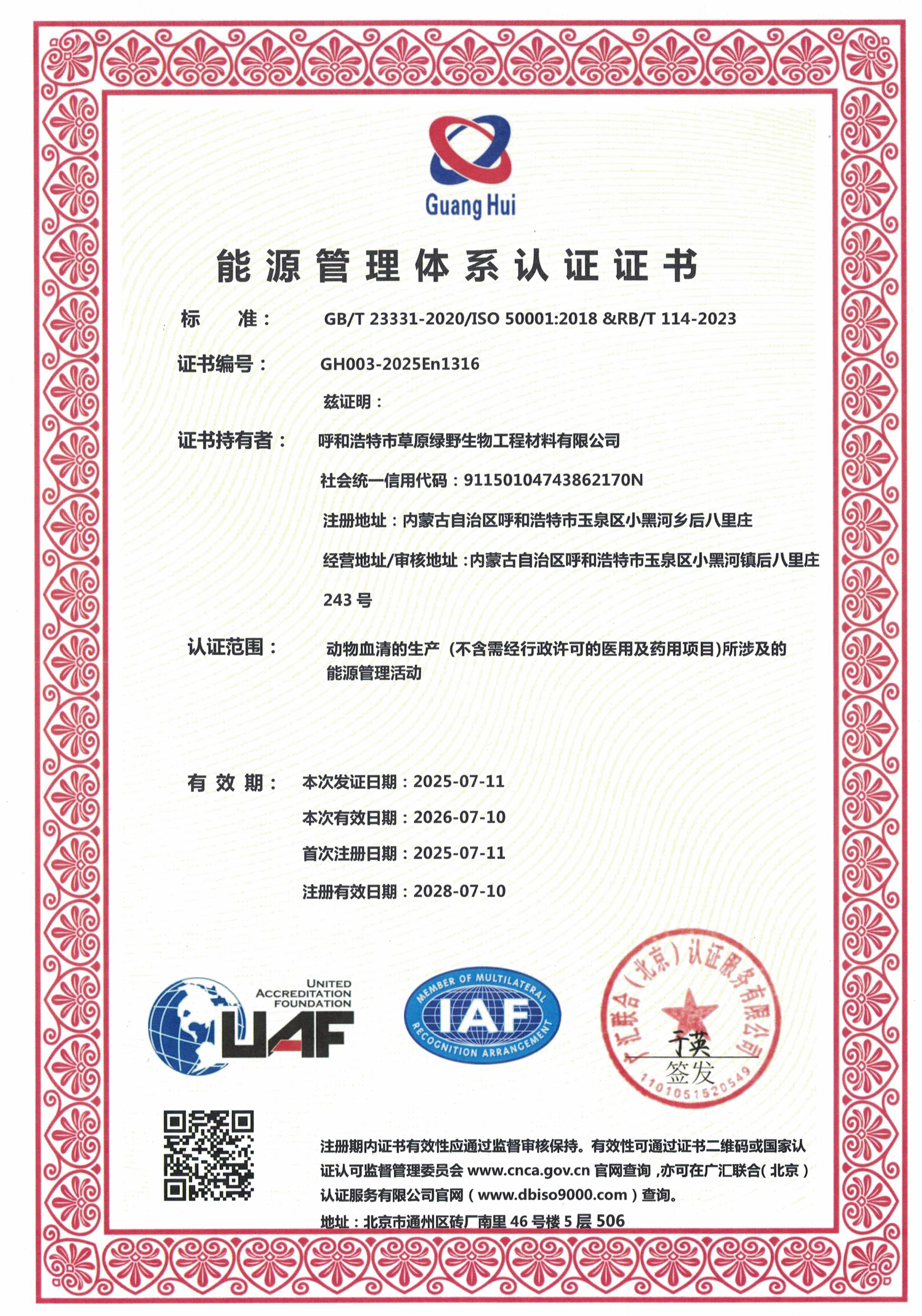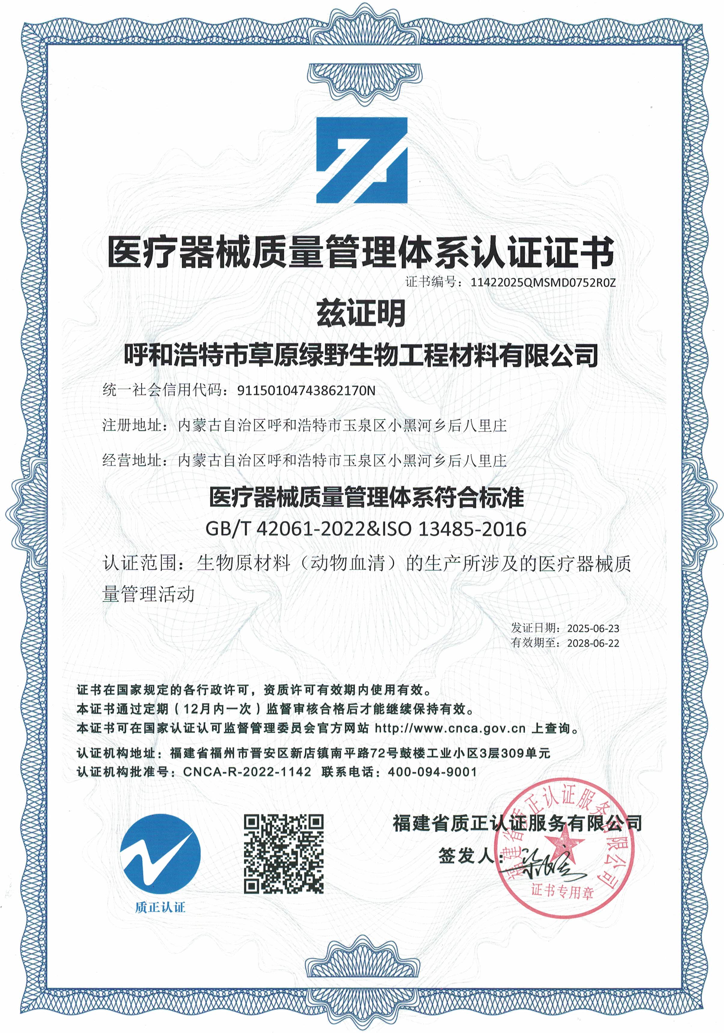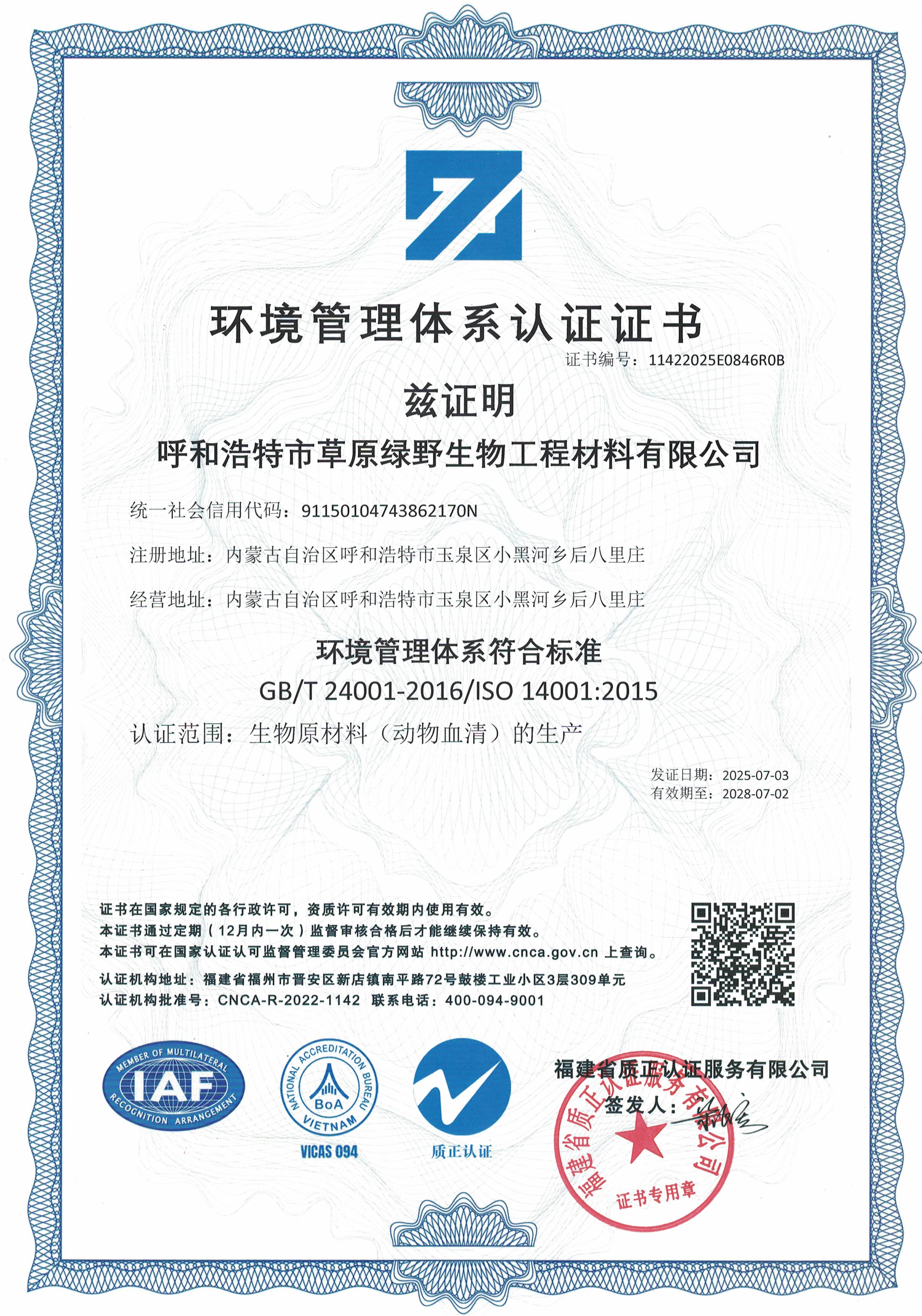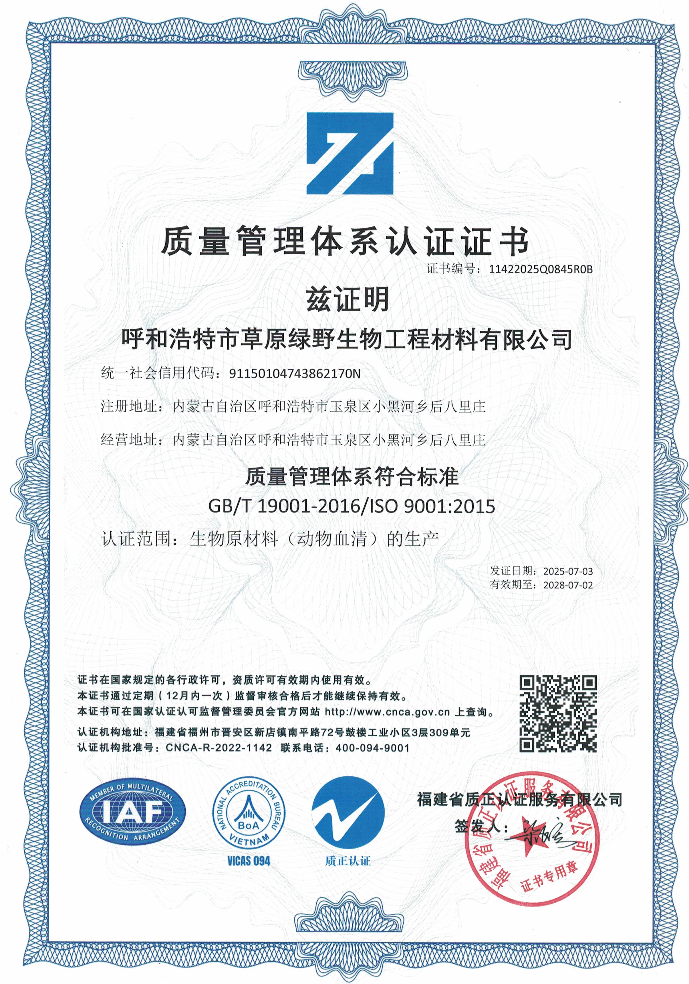 公司至今已多次通過(guò)中國(guó)醫(yī)藥生物技術(shù)協(xié)會(huì)《牛血清生產(chǎn)企業(yè)達(dá)標(biāo)》認(rèn)證、《牛血清生產(chǎn)質(zhì)量達(dá)標(biāo)企業(yè)》認(rèn)證。ISO9001質(zhì)量管理體系認(rèn)證、ISO45001職業(yè)健康安全管理體系認(rèn)證、ISO14001環(huán)境管理體系認(rèn)證、ISO13485醫(yī)療器械質(zhì)量管理體系認(rèn)證、ISO50001能源管理體系認(rèn)證、GB/T29490知識(shí)產(chǎn)權(quán)合規(guī)管理體系認(rèn)證、AAA級(jí)信用企業(yè)認(rèn)證、A級(jí)納稅單位評(píng)審等。